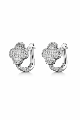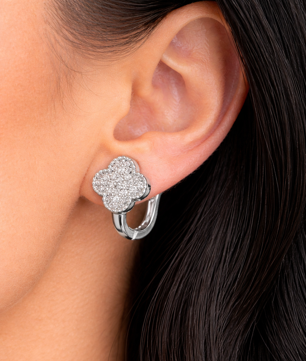 Das filigrane Kleeblatt-Design ist vollständig mit fein gesetzten Zirkonia-Steinen besetzt und sorgt für einen edlen, gleichmäßigen Glanz. Die silberne Fassung unterstreicht den cleanen, hochwertigen Look und verleiht dem Schmuckstück eine minimalistische, aber dennoch ausdrucksstarke Wirkung.