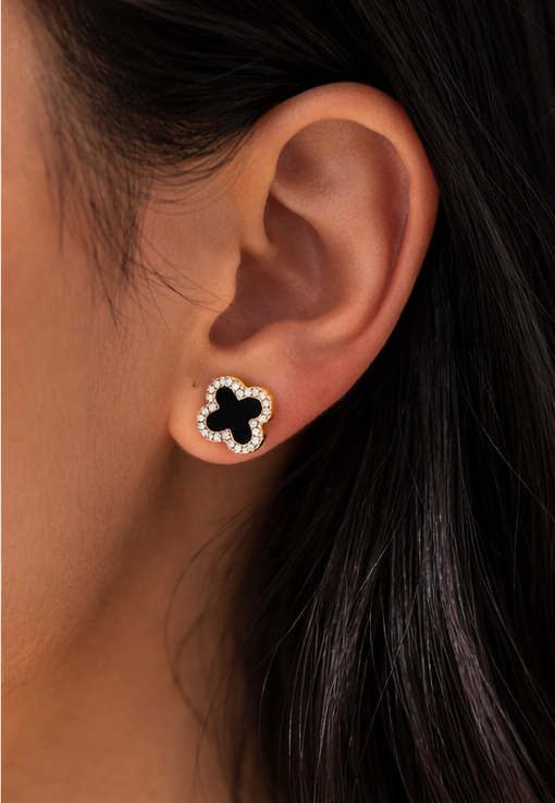 Das ikonische Kleeblatt-Design verleiht dem Schmuckstück eine besondere Bedeutung – ein Symbol für Glück, Schönheit und feminine Stärke. Umrahmt von fein funkelnden Zirkonia-Steinen und kombiniert mit einer tiefschwarzen Mitte, entsteht ein luxuriöser Kontrast, der jedes Outfit veredelt.