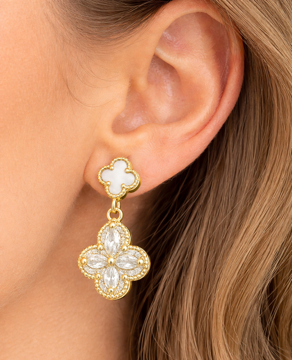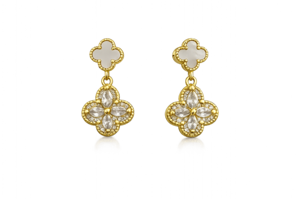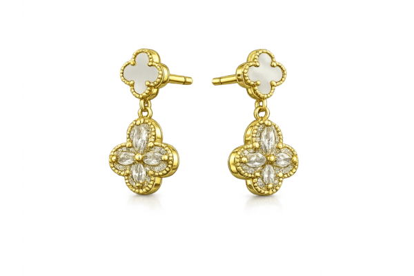 Das doppelte Kleeblatt-Design symbolisiert Glück und zeitlose Schönheit. Die edle weiße Einlage trifft auf funkelnde Zirkonia-Steine und schafft einen strahlenden, luxuriösen Look mit sanfter Bewegung bei jedem Schritt.