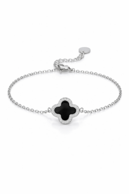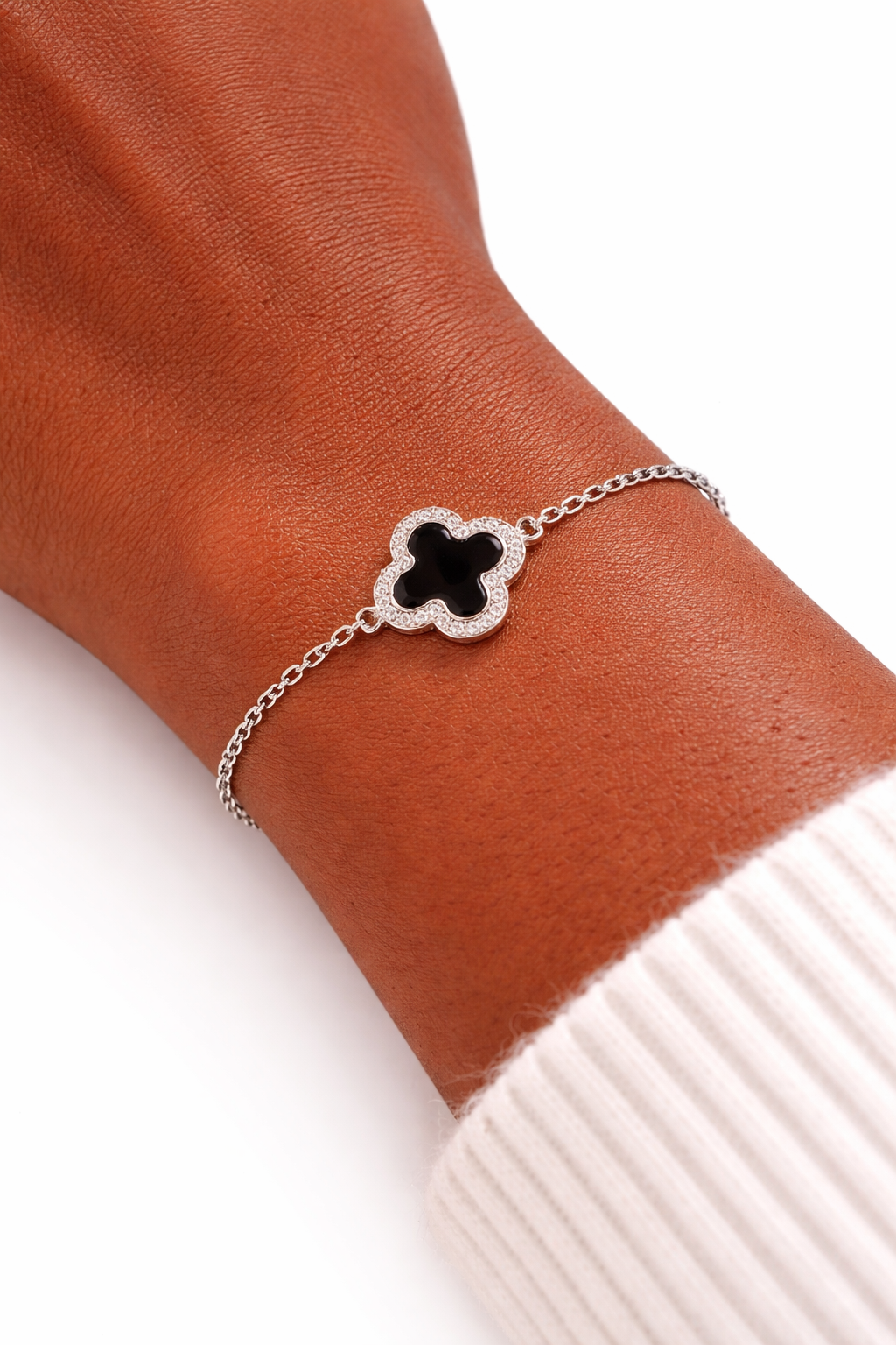Das filigrane Design wird durch ein zentrales Kleeblatt-Element veredelt, das von feinen Zirkonia-Steinen umrahmt wird. Die kontrastreiche Kombination aus tiefem Schwarz und glänzendem Silber verleiht dem Armband eine moderne, edle Ausstrahlung.